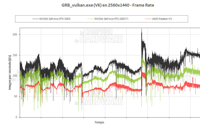 Notons que les cartes embarquant 8 Go de mémoire vidéo sont fortement pénalisées en UHD avec les textures d'ultime à élevé. Nous avons donc été contraints de baisser le réglage de ces dernières à moyen, afin de ne pas saturer leur mémoire vidéo et créer des écarts exagérément élevés du fait de ce point. La 3080 FE n'était pas impactée avec ses 10 Go, à l'instar des 2 Ti et de la Radeon VII. Côté performances, la 3080 prend 26% d'avance sur la 2080 Ti FE en QHD, probablement limitée par le CPU, puisque l'écart passe à 37% en UHD.