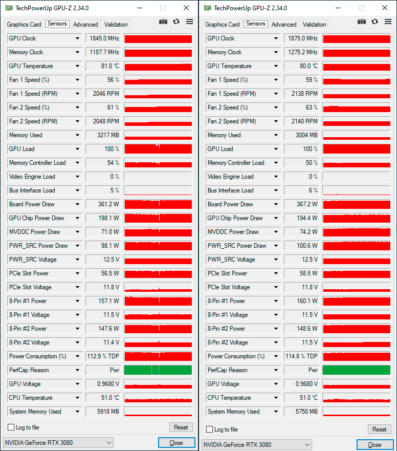 RTX 3080 FE : à gauche en lâchant le TGP (370W) et à droite en overclockant