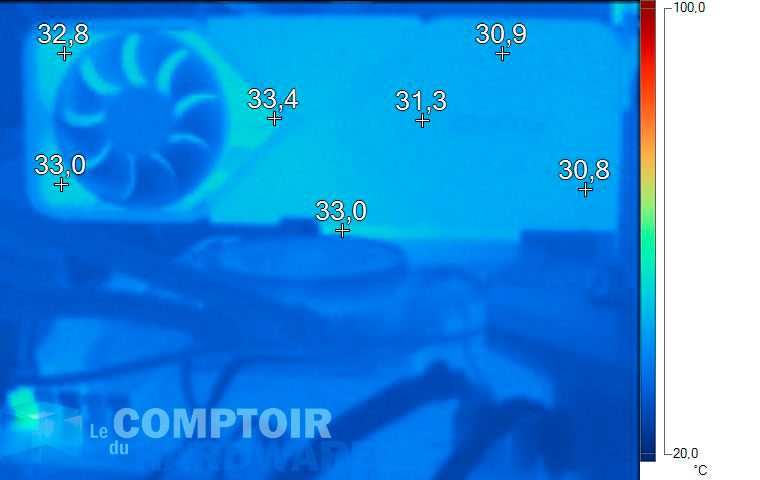 Au repos, Nvidia a dû être sensible aux complaintes des testeurs et acquéreurs de RTX FE, puisque cette fois les ventilateurs sont totalement à l'arrêt. Après une charge, ils restent à vitesse réduite jusqu'à ce que la température GPU atteigne 32°C, avant de se couper à nouveau. C'était un des derniers gros avantages des customs, il n'existe plus à présent. En charge et malgré la consommation très importante, le niveau sonore reste très contenu, puisqu'au niveau de la GTX 1080 Ti et inférieur à la RTX 2080 Ti FE. Précisons toutefois qu'il est valable avec notre boitier qui dispose d'une excellente ventilation, même si cette dernière est coupée le temps des mesures au sonomètre (mais boitier ouvert). Le résultat pourrait être bien moins bon dans un boitier étriqué ou mal ventilé. Toujours est-il que dans les conditions décrites, ce refroidisseur est une grande réussite, permettant à la carte de rester tout à fait supportable, malgré les watts à dissiper.