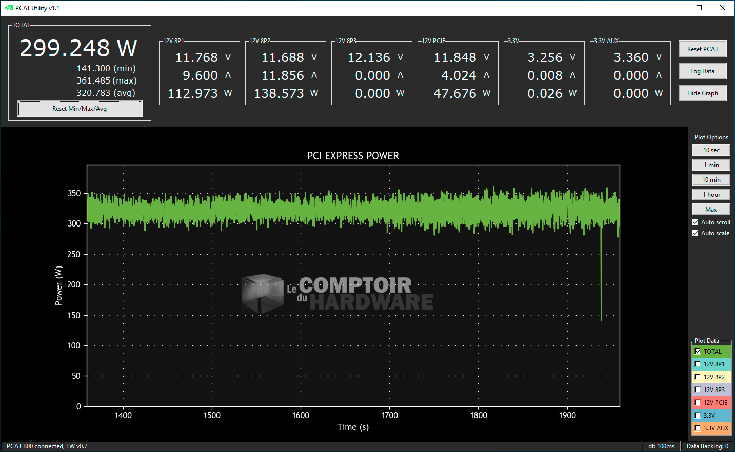 Et lorsque tout ceci dure un peu plus longtemps qu'un simple bench ? Pour répondre à cette interrogation, finissons par le suivi de consommation sous The Witcher III durant une trentaine de minutes à l'aide de PCAT. Cela permet de vérifier le niveau moyen durant une période soutenue, mais aussi d'afficher les différents pics qui pourraient survenir durant cette période. L'intervalle entre chaque mesure est de 100 ms. Les mini, maxi et moyenne sont initialisés dès le lancement du jeu. On constate des pics dépassant les 360 W (et probablement sur des intervalles de mesures plus courts), preuve qu'il ne faudra pas mégoter sur la qualité de l'alimentation utilisée avec une telle carte, Nvidia préconisant 750 W par sécurité. La moyenne sur une période suffisamment longue pour être représentative, respecte quant à elle bien le TGP indiqué.