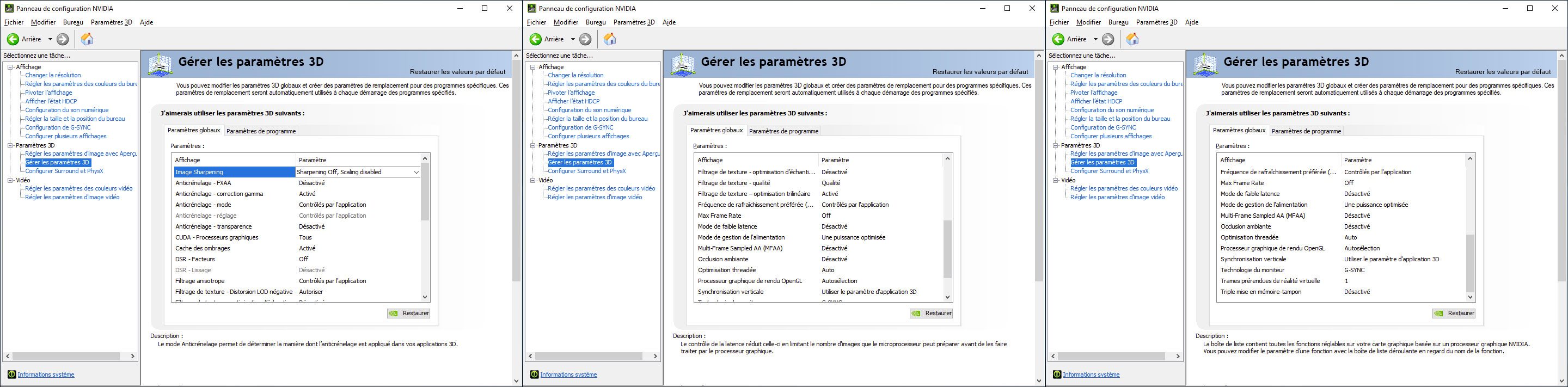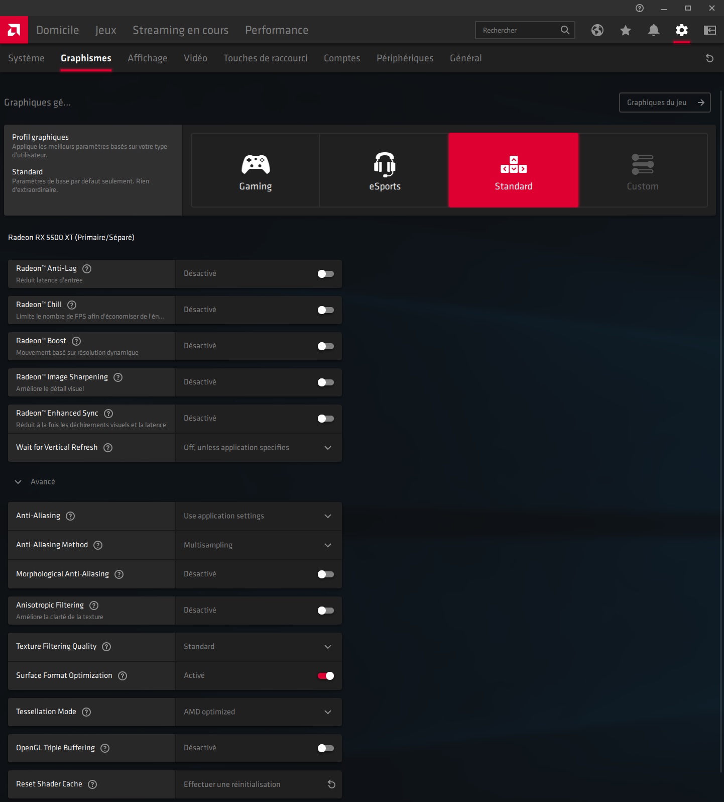 Notez que le panneau de contrôle d'AMD introduit avec les pilotes Crimson et toujours d'actualité avec les Adrenalin 2019, a été "refondu" pour la version 2020. C'est toujours une franche réussite en termes de design et de réactivité, par contre l'accès à certaines fonctionnalités nous semble plus fastidieux. En définitive l'ergonomie nous parait meilleure côté vert, par contre le visuel est largement supérieur côté rouge. Voici les réglages par défaut des RADEON :