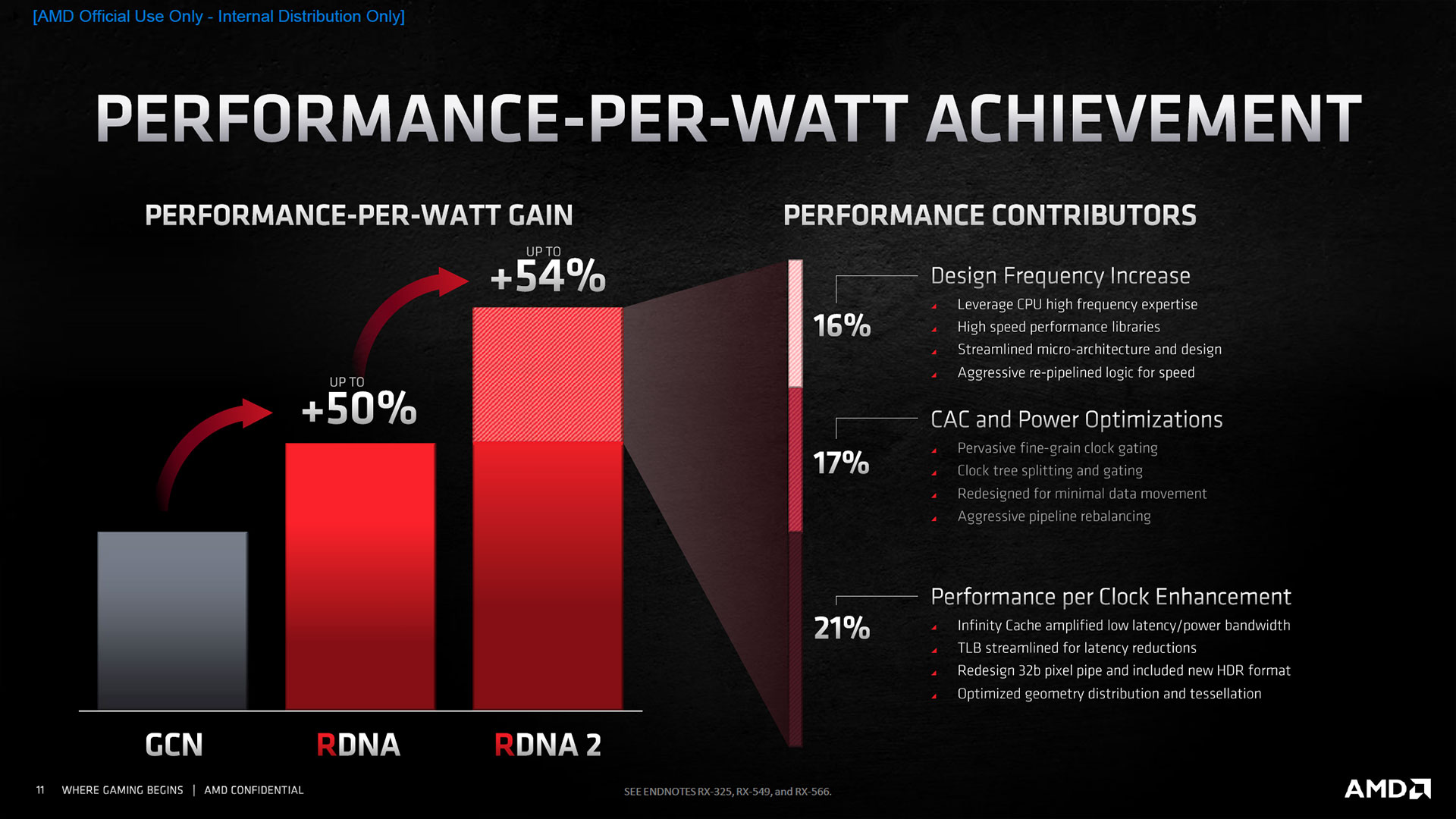 Pour vous aider dans la compréhension des pages à venir, nous vous invitons vivement à lire ou relire, si ce n'est pas déjà fait, celles que nous avions dédiées à RDNA au sein de ce dossier. Cette dernière architecture, est une refonte profonde de la précédente (GCN), avec pour objectif d'améliorer drastiquement les performances par watt. Pour ce faire, AMD a sérieusement revu l'organisation de ses unités de calculs, mais aussi le sous-système mémoire, en particulier la hiérarchie des caches. Pour la seconde itération de cette architecture, les rouges poursuivent dans ce sens avec 3 contributeurs principaux à l'amélioration. Le premier est l'augmentation significative de l'IPC, le second est la réduction de la puissance nécessaire pour atteindre une fréquence donnée ou exécuter certaines tâches, et enfin le dernier consiste à améliorer la capacité à monter en fréquence de l'architecture. Le tout combiné permettrait un gain de 54% au niveau du rapport performances par watt.