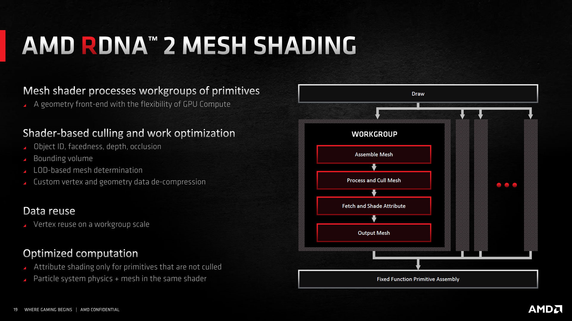 Les Mesh Shader constituent une refonte profonde du traitement de la géométrie, puisqu'au lieu de s'appuyer sur un exécution très peu parallélisée, nécessitant une sollicitation du CPU à chaque objet via une requête (Draw call), une scène complexe à ce niveau va pouvoir être traitée beaucoup plus efficacement. Ainsi, le développeur peut via les Mesh Shader, fournir une liste d'objets (avec le niveau de détails à appliquer à chacun) au travers d'un seul Draw call. Le GPU va ensuite ordonnancer cette liste afin de l'exécuter avec le maximum de parallélisme, et ainsi traiter ces opérations bien plus rapidement que ne le ferait le CPU, lorsque la scène est fortement chargée objets (au sein d'un champ d'astéroïdes par exemple, etc.).