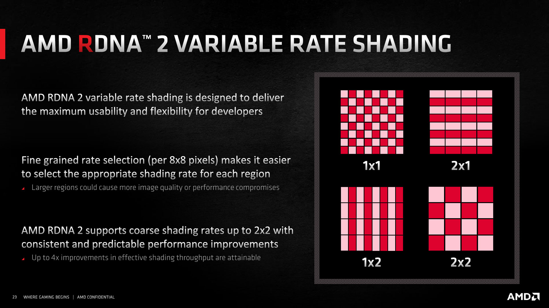 Le Variable Rate Shading est aussi une des fonctionnalités phares ajoutées à RDNA2, puisqu'il permet des gains de performances substantiels, en autorisant les développeurs à jouer sur la finesse de traitement des pixels au sein d'une scène. Le principe est de regrouper les pixels en une multitudes de zones réduites (Tiles), et d'appliquer un niveau de shading variable pour chacune d'entre elles. Ainsi, au sein d'uneTile, le développeur peut avec RDNA2, choisir d'utiliser le taux nominal (1x1 = shading de chaque pixel), ou minimum (2x2) = shading de 4 pixels à la fois) ou une valeur intermédiaire. Ainsi, le gain maximal peut aller jusqu'à un facteur 4, ce qui est moindre que sur Turing/Ampere (x16), tout en proposant moins de choix (4 contre 9), du fait d'une taille de Tile plus restreinte (8 x 8 pixels vs 16 x 16). AMD indique que des Tiles plus importantes (comprendre celle de Nvidia) complexifient le choix au niveau de débit, entraînant trop de compromis visuels ou de performances.