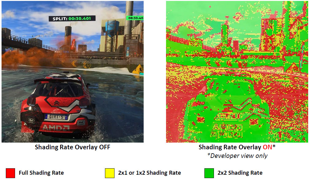 Bien entendu, il ne faut pas s'attendre à ce qu'AMD ou Nvidia explique autre chose que leur choix soit le plus pertinent, mais comme toujours ce seront les développeurs qui décideront en définitive de la meilleure approche, selon l'usage qu'ils en feront. Dans le test VRS de 3DMark, les RX 6000 proposent des gains supérieurs à leurs concurrentes vertes, étayant l'assertion des rouges, même s'il est difficile de généraliser sur un seul exemple. A ce titre, DiRT 5 en est un autre favorable, et AMD présente la mise en œuvre du VRS au sein de ce dernier. En vert, le moteur se contente de rendre une seule valeur pour un groupe de 4 pixels, en jaune pour un groupe de 2 et enfin vous l'aurez compris, en rouge pour chaque pixel. La carrosserie de la BX C3 étant constituée de larges zones identiques, il est facile d'unifier les groupes de pixels sans dégrader la qualité perçue. A contrario, les aspérités du revêtement routier et son déplacement rapide, imposent un taux de shading maximal.