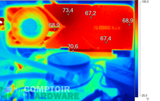Du fait de sa conception double face, il n'est pas possible de démonter le refroidisseur sans altérer son fonctionnement, limitant d'autant la pertinence des images thermiques. Au repos, la carte conserve une température très contenue, et ce malgré la ventilation coupée. En charge à présent, la face arrière oscille selon les endroits entre 65 °C et 73°C. Le PCB visible dépasse les 70°C, et d'après les relevés de GPU-Z, la GDDR6X atteint 96°C. Bref ça chauffe dure là-dedans et on comprend pourquoi Nvidia a du déployer une ingénierie innovante pour maintenir des nuisances sonores acceptables au sein d'un refroidisseur limité à 2 slots.