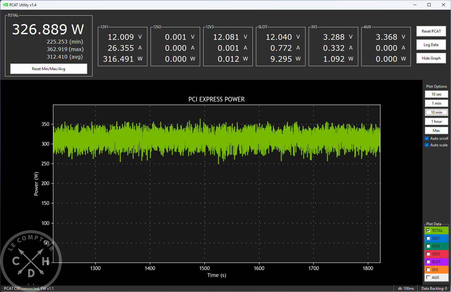 Comme vous pouvez le remarquer, la carte de MSI fait le yoyo, alternant entre les meilleurs résultats et parfois les moins bons. Nous supputons qu'en plus de la raison évoquée précédemment, la gestion des différentes phases de l'étage d'alimentation est peut-être moins fine que sur d'autres modèles, entraînant une consommation non optimale lors de charges intermédiaires. Et quand tout ceci dure un peu plus longtemps ? Nous vous proposons le suivi durant 30 min d'une charge soutenue (A Plague Tale : Requiem) pour la RTX 4080 FE. La moyenne se stabilise un peu plus bas que lors de notre séquence de test plus brève, avec un pic maximum mesuré à 363 W. La recommandation d'une alimentation de 750 Watts pour la RTX 4080 FE, parait donc pertinente.