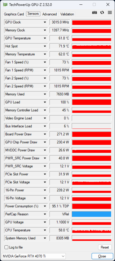 Nous avons donc utilisé ce bios pour représenter une 4070 Ti respectant scrupuleusement les fréquences de référence, en appliquant un bin négatif à la consigne du boost (2610 MHz au lieu de 2625 MHz). En pratique, le offset négatif va conduire à une augmentation du taux d'utilisation du TGP, puisque l'on décale défavorablement la courbe fréquence/tension. Dans les 2 cas, l'enveloppe de puissance n'est pas contraignante et nous obtenons des moyennes durant 30 mn de 2806 MHz (@ 4070 Ti) et 2820 MHz (OC) très proches des maximums respectifs (2835/2850 MHz).