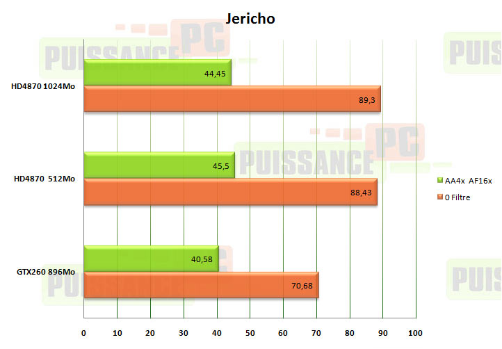 C'est devenu désespérant, mais on commence à s'y habituer. la GTX260 marque le pas, mais procure la même expérience de jeu que les HD4870. En effet 70 ou 90 ne changent pas grand chose tout comme 40 et 45 ips. Pour l'instant rien qui ne justifie l'achat d'une HD4870 1024Mo, si vous devez jouer en 1920 au maximum.
