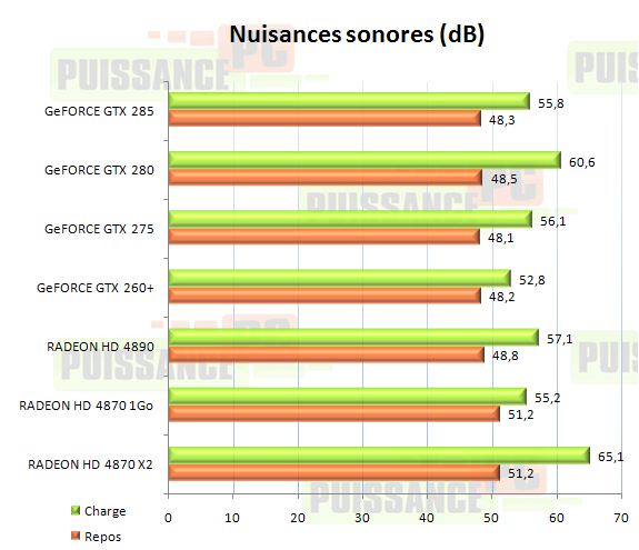Nous avons évalué les performances et la consommation de nos cartes, qu’en est-il des nuisances sonores? Les mesures sont réalisées à l’aide d’un sonomètre placé à 20cm du boîtier ouvert. Il est temps de juger de l'efficacité des ventirads maison de Gainward, tout du moins sur le plan sonore. Au repos, ce sont les Gainward employant le système de refroidissement alternatif qui se montrent les moins bruyantes devant les Radeon 4890 utilisant le refroidisseur d'origine AMD et GTX 280 utilisant cette fois le ventilateur d'origine nVIDIA... La 4870 X2 et la 4870 1Go de Gainward fermant la marche.