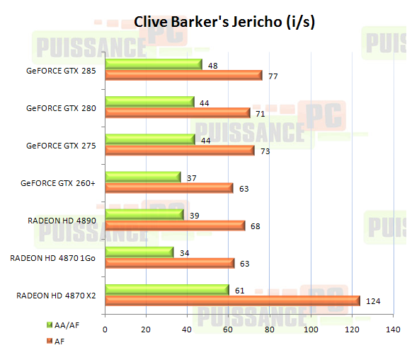 Jericho penche à nouveau nettement côté vert. Sans AA la 4870 fait jeu égal avec la GTX 260 quant à la 4890 elle ne parvient pas à accrocher la GTX 280. Avec, l'impact est plus important côté AMD puisque la GTX 260 prend l'ascendant sur cette dernière et talonne la 4890. Le multi-GPU est ici d'un grand secours pour le framerate puisque la 4870 X2 est la seule à apporter un framerate parfait avec AA et sans contrepartie visuelle notable.
