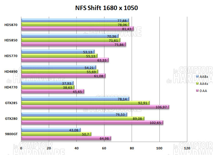 Les cartes HD5800 sont largement derrière les cartes Nvidia GTX, sauf avec l'AA 8x où elles sont du même niveau. Est-ce une faiblesse de l'architecture, des pilotes trop jeunes ou un jeu unilatéralement codé ? Nous penchons vers la seconde hypothèse, en effet il faut bien souvent 2 à 3 révisions de pilotes pour commencer à avoir une carte mâture et stable sur l'ensemble des moteurs du marché. La HD5770 est très proche de la HD4890 ce qui est assez rare pour être souligné. Les performances de la HD4770 la placent sous la 9800GT, tandis que les 512Mo et l'AA 8x castrent complètement les performances des deux petites qui sont anecdotiques.