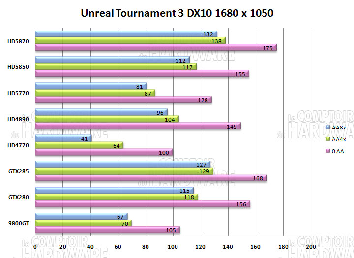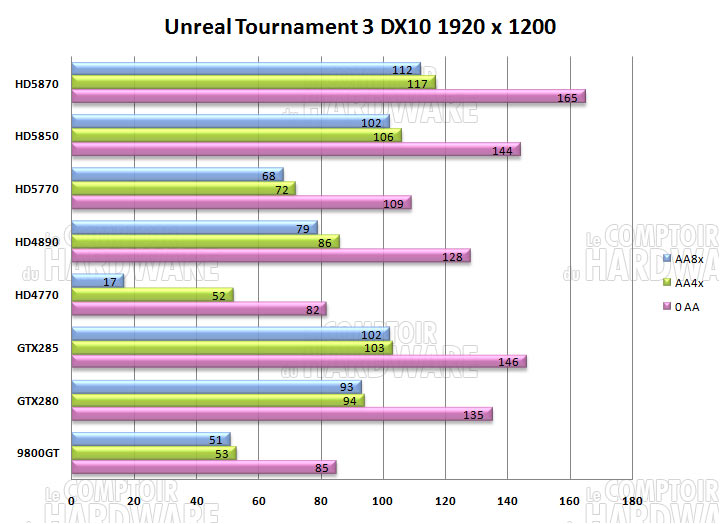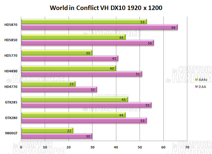 Traditionnellement ce jeu a toujours été plus rapide sur les cartes Nvidia que leurs homologues AMD. Ainsi la HD4890 qui se retrouve à bonne distance des GTX se voit vengée par la HD5850 d'une part qui recolle à la GTX285, et la HD5870 d'autre part qui est respectivement 25% et 20% plus rapide en 1680 sans et avec AA. La situation est identique en 1920. Le chassé croisé continue entre la 9800GT qui domine en 1680 et la HD4770 qui prend le dessus en 1920. Par contre pas de chassé croisé entre la HD5770 et la HD4890 qui lui règle définitivement son compte.