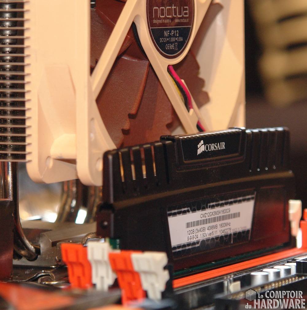 Typiquement, sur notre machine en P55 équipée d’un ventirad Noctua NH-U12P, nous avons dû utiliser les slots mémoire «extérieurs » (à droite) de la carte mère, le slot le plus à gauche et le plus proche du socket étant inutilisable à cause du ventilateur (ou des barrettes trop hautes, au choix). Quelle que soit votre plate-forme, si vous comptez utiliser les slots proches du socket : attention ! A noter d’ailleurs que les modules viennent obstruer légèrement le flux d’air du ventilateur tellement ils sont hauts. Tout ceci en images avec de nouveau notre trio de modules (OCZ et Patriot Sector 5 en plus) :