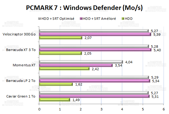Pour le test de démarrage d'applications, le gain est énorme en pratique, il est difficile de trouver une réelle différence entre les 2 modes. Les différents disques sont très proches après accélération hormis le Momentus XT un ton en dessous alors qu'il dominait sans SRT, hybride oblige. Bis répétita sous Defender avec un écart encore plus important avec SRT en défaveur du Momentus XT où la double hybridation ne semble pas lui réussir...