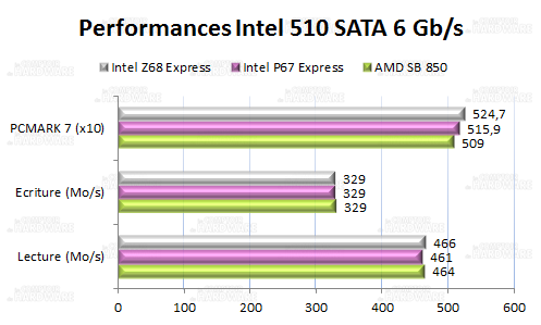 Selon les tests l'apport d'un SSD plus rapide est plus ou moins marqué, notons qu'à chaque fois les performances du couple HDD+SSD sont proches du SSD, reste qu'il s'agit ici du cas le plus favorable où la répétitivité des tests met en valeur l'hybridation, il n'est pas certain du tout qu'un utilisateur lambda constate de tels gains suivant ses sollicitations ... Finissons nos mesures par les performances comparées des contrôleurs intégrés aux Z68, P67 et SB850 en mode 6 Gb/s sur un SSD Intel 510 de 250 Go.