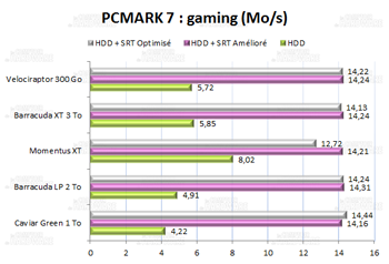 On poursuit avec le test Gaming, encore une fois le Momentus XT domine sans SRT mais décroche avec, uniquement en mode optimisé ceci dit ! Windows Media Center profite très peu de l'hybridation du Momentus XT, il en est de même pour les autres HDD avec SRT activé.