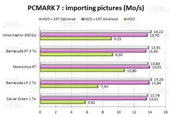 Continuons avec le test adding music, le Momentus XT devance tout juste le Velociraptor sans SRT, avec, les gains sont très limités et les différentes solutions très proches. Importing pictures permet au Momentus XT de reprendre l'ascendant sur ses concurrents directs, avec le SRT activé les gains sont conséquents et toutes les solutions se valent.