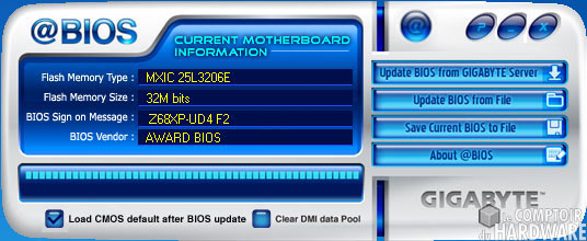 C'en est fini de la description non exhaustive d'EasyTune 6. Le bundle logiciel ne s'arrête pourtant pas là, et il est temps de vous parler des softs secondaires made in Gigabyte. Tout d'abord il y a @Bios, utilitaire de flash Bios à partir de Windows. Vous pouvez le faire à partir de fichiers présent sur votre dédé ou en vous connectant automatiquement aux serveurs Gigabyte.