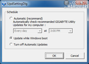 Il y a également Cloud OC qui est un utilitaire qui vous permet d'overclocker votre PC à partir d'un mobile, dont on s'interroge encore sur l'utilité de la chose, à peu près aussi ludique que ceux qui veulent overclocker avec des palmes, pendus à une poutre de la maison, et en respirant de l'hélium. Dans la même trempe, il y a Update Manager, un utilitaire qui se propose de mettre à jour vos softs Gigabyte à heures fixes, définies par l'utilisateur; vous en fait.