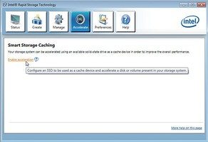 En premier lieu, il convient d'installer l'Intel Rapid Storage que vous trouverez ici. Après avoir rebooté le PC, il suffit de lancer le logiciel, cliquer sur l'icône Acceleration, choisir l'unité SSD qui va servir à l'accélération par la mise en cache, et lui allouer la taille que l'on souhaite jusqu'à 64Go maxi.
