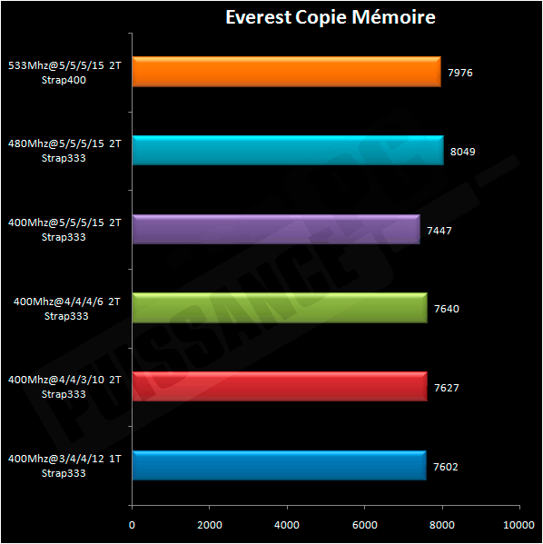 Quels résultats vont donc nous apporter nos différents réglages lors de la copie mémoire? Tout comme dans le cas de la bande passante en lecture, la fréquence joue un très grand rôle, mais ce n'est pas tout :