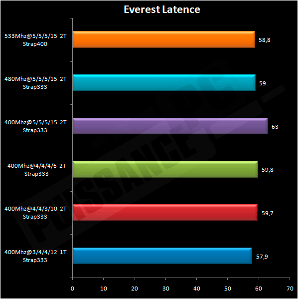 En effet on constate que le réglage 480Mhz devance celui à 533Mhz. Pourquoi donc? Eh bien le Strap mon ami qui passe de 333 à 400 entre les deux fréquences. Ainsi l'handicap du à ce changement de Strap n'est pas compensé lors de la copie mémoire par un gain de 53Mhz sur la fréquence. Pour les réglages à 400Mhz, c'est très proche hormis le plus lent (5/5/5) légèrement décroché. Toutefois et conformément aux précédents benchs, l'écart entre le meilleur et le pire réglage se limite à quelques pourcents (8). Terminons les tests issus d'Everest via la mesure de la latence en millisecondes (le score le plus faibles est le meilleur) :