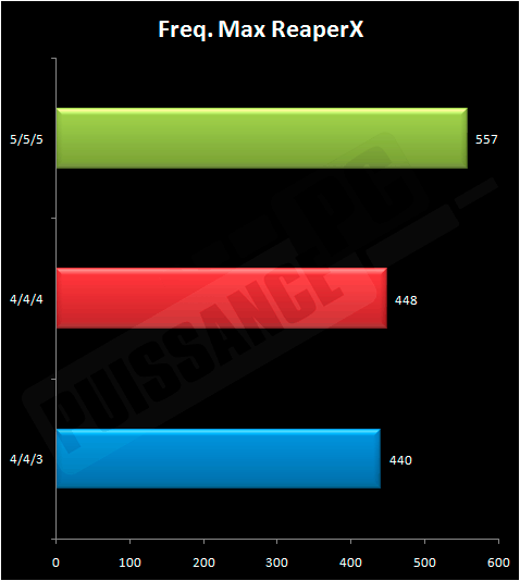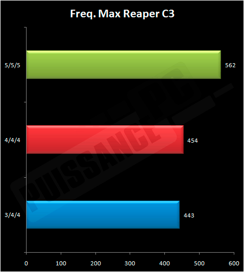 Nous allons débuter par le Kit 2Go Reaper C3. Bien que les barrettes soient garanties jusqu'à une tension de 2,4v, nous nous sommes contentés de 2,2v afin d'obtenir des résultats comparables avec le test précédent où nous avions fixé à 2,2v la tension des G.Skill 6400HZ entre autres. Trois réglages de timings différents ont été adoptés, d'une part le 3/4/4 caractéristique de ce kit, puis les plus classique 4/4/4 et 5/5/5. Voyons les résultats exprimés en Mhz correspondant à des fréquences validées par 3 passes de Memtest86+ :