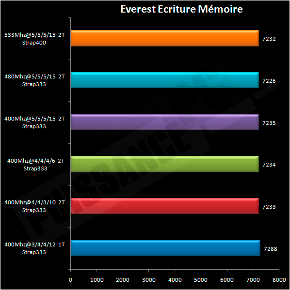 Ainsi on retrouve en tête les réglages à 533 et 480 Mhz, derrière, les timings les plus agressifs se taillent la part du lion en particulier le Cas Latency 3 qui (bien aidé par le mode 1T) devance fort logiquement les 3 autres réglages à 400Mhz. Toutefois les écarts reste limités car inférieurs à 10% entre le meilleur et le moins bons. Voyons le test d'écriture à présent :