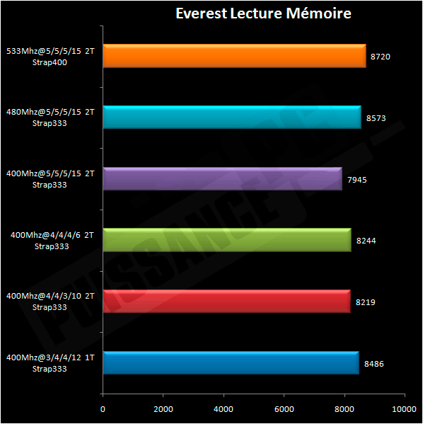 Ca se passe de commentaire, ou presque! Tous les réglages font sensiblement jeu égal et l'asynchronisme n'apporte rien à ce test malgré une fréquence mémoire bien plus élevée! Continuons avec Everest et ses tests mémoires.