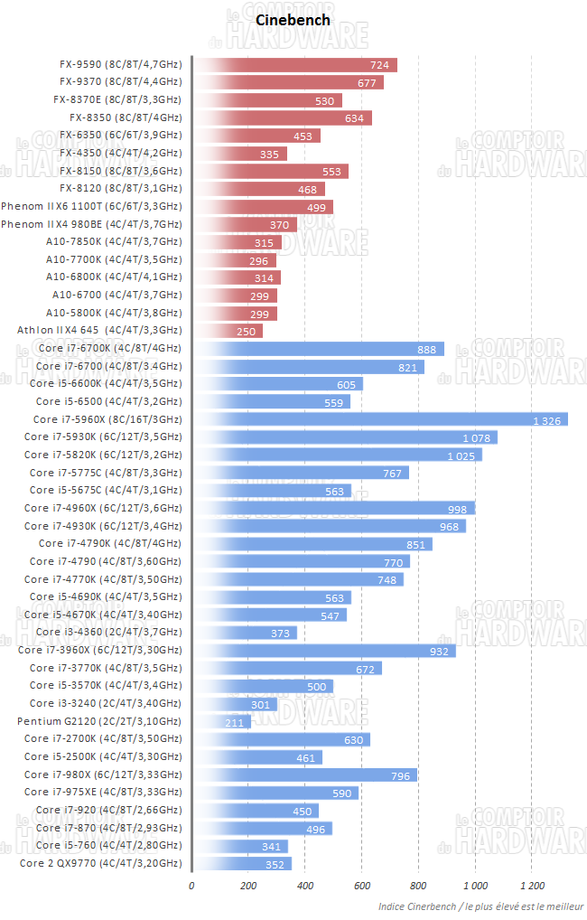 Et de 3 pour le 6700K avec un écart de 7% en sa faveur par rapport au 4790K, ce qui commence donc à devenir notable. Le 6600K dispose d'une avance similaire sur le 4690K. Broadwell finit derrière Skylake, mais encore une fois, le 5675K arrive à devancer son pendant Devil's Canyon alors que ce n'est pas le cas de son grand frère.
