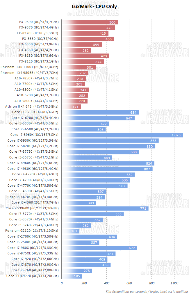 C'est LuxMark 2.0 qui se charge de débuter cette section. Il s'agit d'un bench mesurant les performances des CPU et GPU au travers d'une scène calculée via le moteur de rendu LuxRender s'appuyant sur OpenCL. Nous installons pour cela les SDK spécifiques à chaque constructeur et nous utilisons le bench en activant le rendu CPU uniquement.