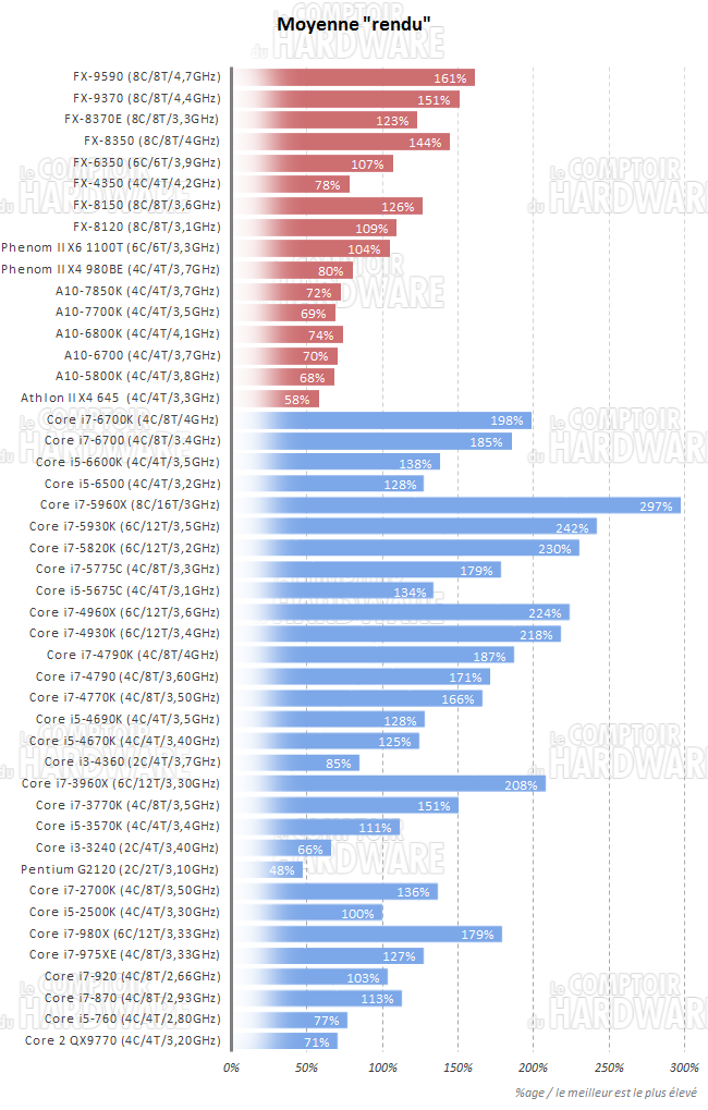 Afin de résumer le comportement de nos protagonistes du jour avec les applications de rendu, voici une moyenne récapitulant cette page. Sans surprise puisque le 6700K l'avait emporté systématiquement sur le Core i7-4790K, le premier cité devance donc le second de 6%, quant au Core i5-6600K, il porte son avance à près de 8% sur le 4690K.