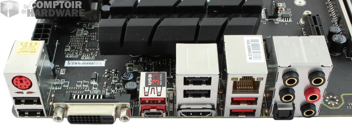 6x USB3.1 Gen1 natifs, 2x arrière, 4x interne. 2x USB3.1 Gen2 (type-A et C) arrière (ASMedia ASM1142) |