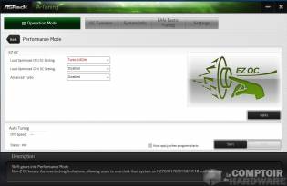 On commence par le mode totomatique avec 3 possibilités sur cette ASRock. On passe soit par le bios pour envoyer des profils pré-enregistrés @4.2, 4.4, 4.6 et 4.8 GHz ou alors via l'application A-Tuning pour charger ces mêmes profils (reboot nécessaire). Sinon, toujours dans l'application A-Tuning, on peut utiliser la fonction auto-tuning, laquelle s'occupe de faire monter progressivement la fréquence CPU et de lui faire un pseudo stress test à chaque fois.