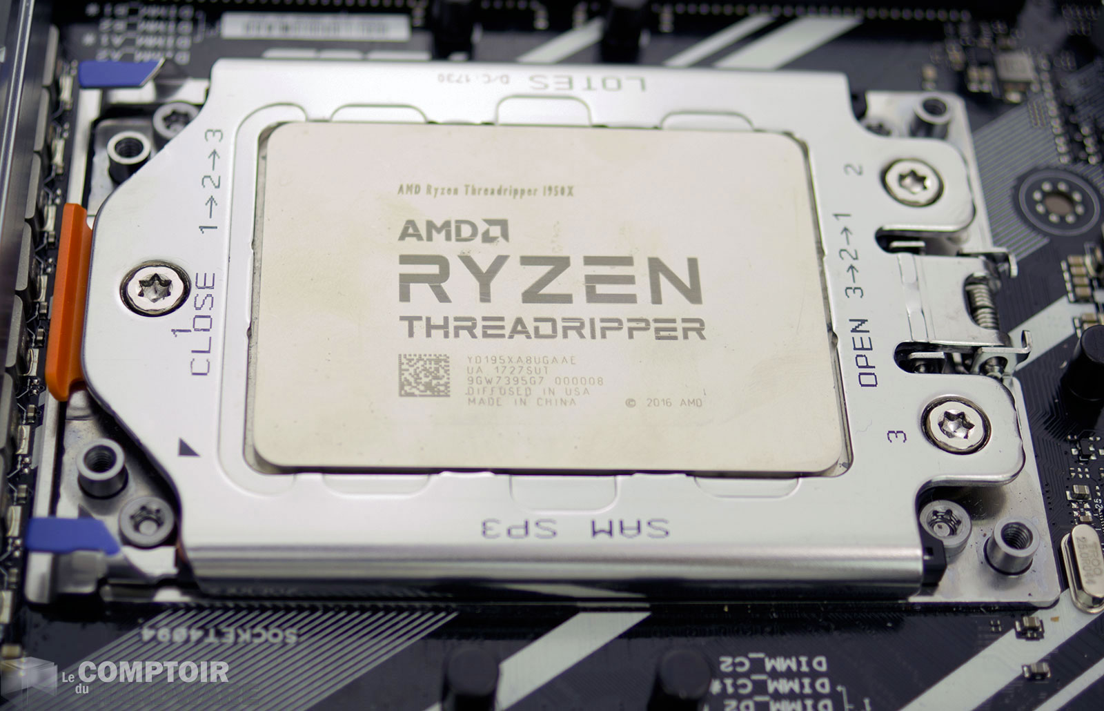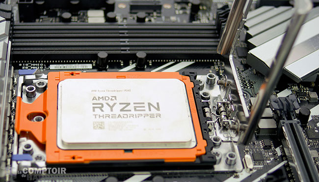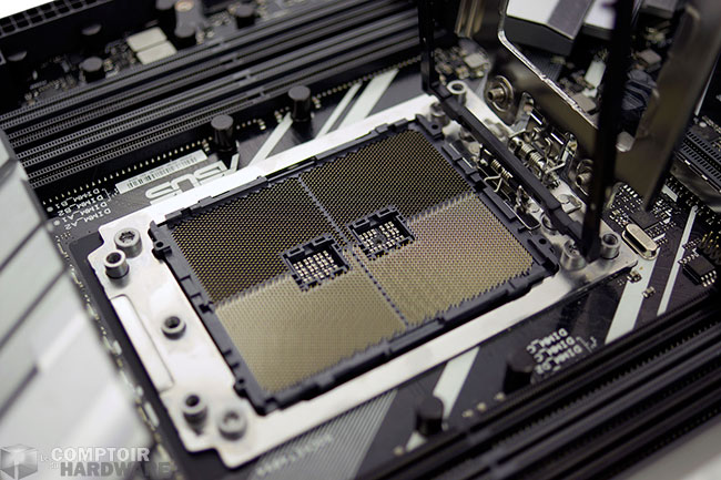 Pour accompagner ces nouveaux CPU, AMD lance une nouvelle plateforme TR4. Nous l'avons toutefois évoqué précédemment, le terme nouveau n'est pas tout à fait adapté, puisqu'il s'agit du renommage du socket SP3r2 dédié aux puces Epyc pour serveurs. Les pins sont à présents déportées sur le socket et très franchement, il valait mieux pour les maladroits, avec pas moins de 4094 points de contacts ! Pour éviter les accidents malheureux, AMD a conçu un système sécurisant la mise en place du CPU.