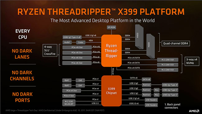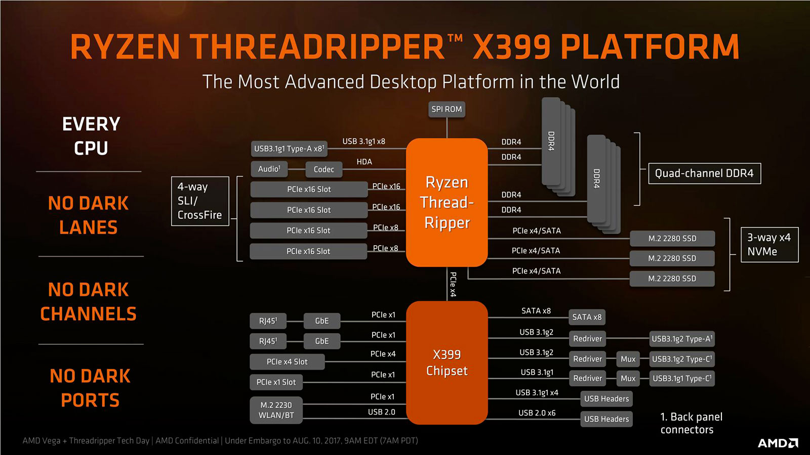 Pour animer sa nouvelle plateforme, AMD propose le chipset compagnon X399. A l'instar du X370 dont il partage de nombreuses caractéristiques, il est raccordé au CPU par 4 lignes PCIe 3.0 et propose bien entendu l'USB 3.1 Gen 2 natif, ainsi que pléthore de connexions en tout genre. Difficile de faire la fine bouche ici.