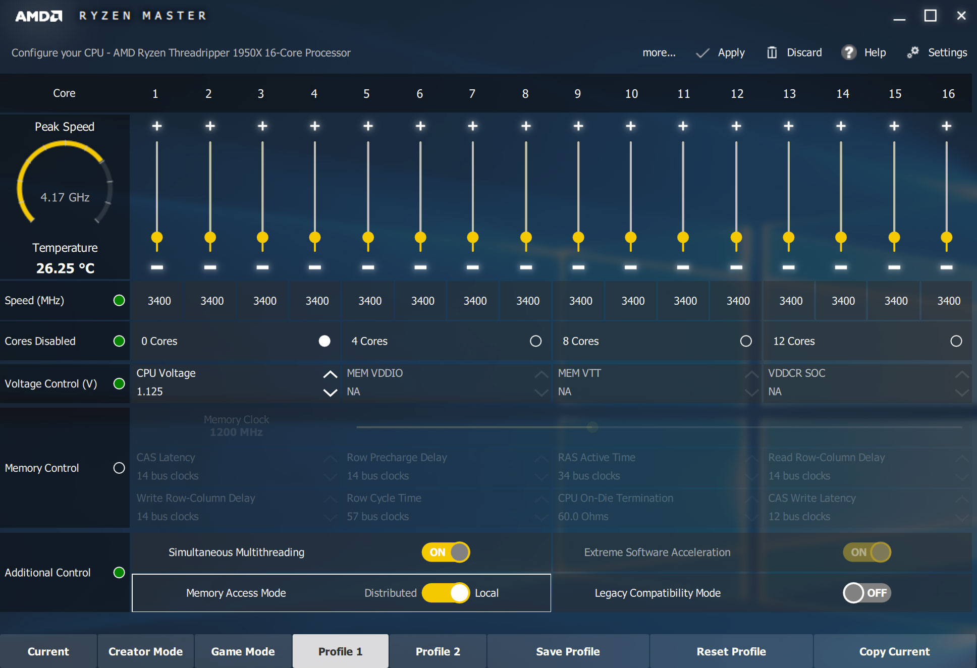 A contrario, le mode NUMA (Non Uniform Memory Access) permet avec l'assistance du système d'exploitation, de tenter d'agencer les données pour qu'elles soient stockées sur un canal mémoire du CPU qui les traitera. L'idée de départ est simple et logique, mais comme souvent, l'efficience de ce protocole variera grandement selon les applications, c'est pourquoi AMD désactive ce dernier par défaut. Il est toutefois possible de l'activer via Ryzen Master (redémarrage imposé) en passant l'option Memory Access Mode de Distributed (UMA) à Local (NUMA). Notons qu'AMD indique que les performances auront tendance à être supérieures en jeu avec NUMA, alors que les applications préféreront généralement le mode UMA. Les profils Ryzen Master Game Mode et Creator Mode activent en conséquence le protocole adéquat.