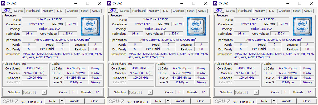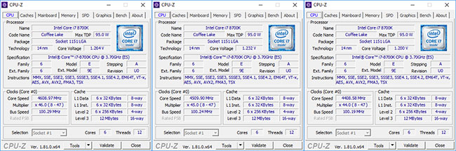 Que nous apprend CPU-Z sur le Core i7-8700K ? Tout d'abord, son TDP est plutôt restreint à 95 W pour un 6 cœurs 12 Threads, sachant que le 7700K (4C/8T) nécessite tout de même 91 W. L'écart est plutôt marginal entre les deux, mais nous y reviendront. Cela explique en tout cas une fréquence de base plus conservatrice, à 3,7 GHz. Le cache L3 progresse logiquement à 12 Mo (2 Mo / core) pour suivre l'inflation du nombre de cœurs.