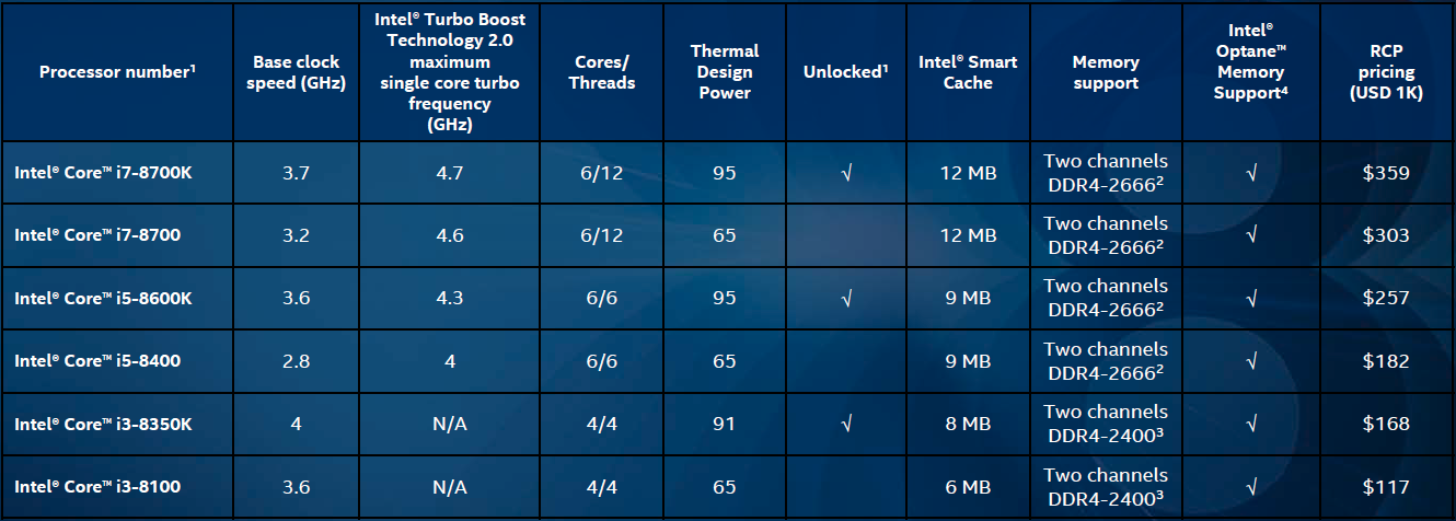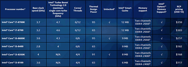 Les 8700K et 8600K sont facturés respectivement 20 et 15 $ de plus que leurs devanciers, les autres reprenant le tarif des modèles qu'ils remplacent. Intel ne détaille pas les fréquences de ces CPU, tout juste sont connues celles de base et de Turbo Max. mais sans précision quant au nombre de cœurs sollicités pour atteindre cette dernière. On notera que le 8350K dispose de 8 Mo de cache L3, contre 6 au second i3. Les TDP indiqués sont également particulièrement agressifs pour les 6 cœurs, puisque n'évoluant presque pas par rapport aux Quad-core. Soit le 14 nm a grandement progressé, soit les fréquences sont bien plus basses en charge lourde, soit ces valeurs sont tout simplement sous-évaluées.