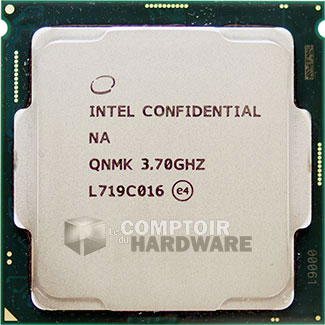 Débutons notre description par le Core i7-8700K. Le format est celui classique des CPU LGA 115x, la face avant de ce dernier laissant une impression de déjà-vu, et pour cause, il s'agit d'une copie conforme d'un Kaby Lake avec les mêmes épaulements au niveau du heatspreader. La face arrière montre de légères différences au niveau des composants CMS soudés au centre, par contre les points de contact reprennent les mêmes nombre (1151) et disposition. Il en est de même pour les détrompeurs, inchangés.