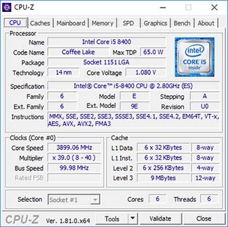 Passons à présent au second CPU du jour, le Core i5-8400. Par rapport à son grand frère, le nombre de cœurs est similaire mais l'hyperthreading est désactivé. Le cache L3 est réduit de son côté à 9 Mo, quant à la fréquence de base, elle chute à un petit 2,8 GHz, du fait d'un TDP ramené à 65 W. La tension de fonctionnement relevée sous CPU-Z étant elle aussi en baisse (et toujours plus élevée sur la carte d'Asus par rapport à celle de Gigabyte). En charge avec un seul cœur actif, la fréquence atteindra tout de même 4 GHz.
