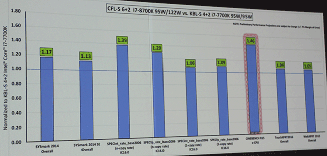 On précisera que lors de nos mesures, les TDP officiels des Core i5 et i7 Coffee Lake nous ont paru bien peu représentatifs des consommations réelles (ce qui n'est pas le cas du Core i3), tout du moins sur la carte d'Asus survoltant les processeurs. Nous n'avons d'ailleurs noté aucun throttling à l'image des puces plus haut de gamme, pour rester dans l'enveloppe thermique officielle. A l'occasion d'une conférence de pré-lancement organisée par le constructeur, nous lui avons posé la question du pourquoi une telle différence entre TDP officiel et mesuré. Pour seule réponse, des sourires embarrassés, comme si ces derniers découvraient ce point... Ci-dessous, une photo d'un slide projeté durant la conférence d'Asus. Vous noterez la présence d'une seconde valeur pour le TDP du 8700K, à 122 W, et qui correspond, elle, bien plus à la réalité que nous avons mesurée avec la carte fournie...