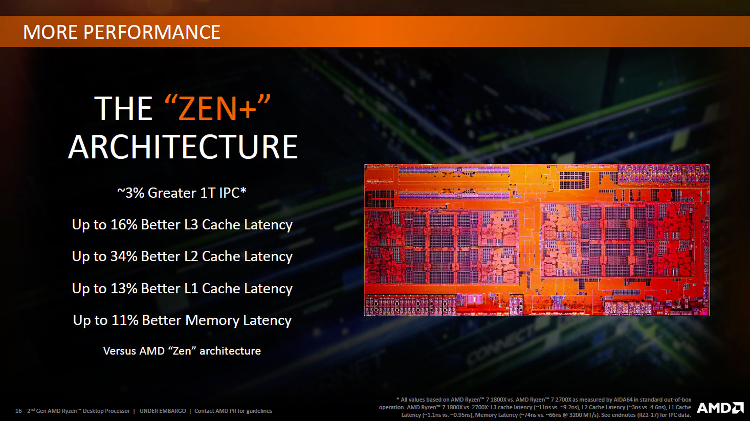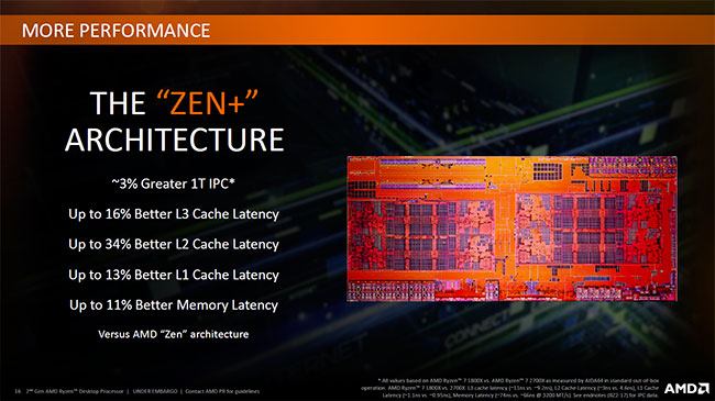 Comme nous l'indiquions en débutant ce dossier, les nouveaux CPU d'AMD s'appuient sur ZEN+, une amélioration de l'architecture originelle ( ceux intéressés par plus de détails peuvent se diriger vers ce dossier) censée conduire à des gains d'environ 3% au niveau de l'IPC. En pratique, ces derniers seraient issus de latences en baisse significative sur tout le sous-système mémoire et caches. AMD reste évasif sur la manière dont ces gains ont été obtenus, il est probable que des "réglages" plus agressifs au niveau des différents timings en soient l'origine.