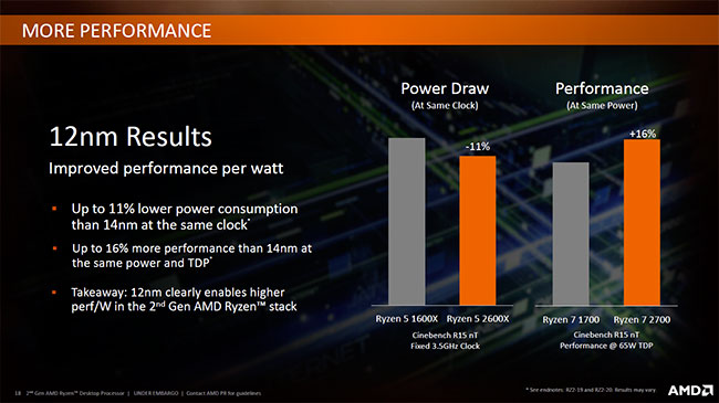 Pourquoi ne pas l'avoir fait précédemment ? Eh bien tout simplement parce que les transistors ne le permettaient pas avec le process 14 nm l'année dernière, ce qui n'est plus le cas avec le nouveau 12 nm de Global Foundries. Notons que cette appellation peut être sujette à caution (tout comme celle de TSMC), puisqu'il s'agit plus d'un 14 nm optimisé que d'un réel nouveau Node, mais les fondeurs ont depuis quelque temps pris certaines libertés à ce niveau pour nommer leurs différents process.