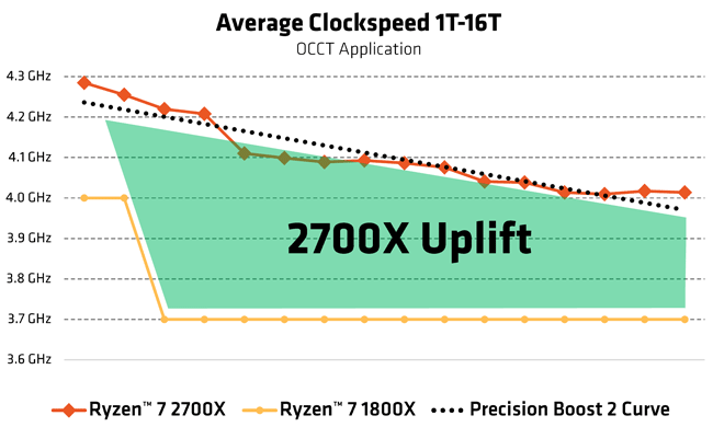 Pour tirer le meilleur parti du nouveau process de gravure, AMD a utilisé la seconde itération de Precision Boost (la dénomination du turbo maison), déjà étrennée par les Raven Ridge et qui permet de maintenir de manière opportuniste une fréquence plus élevée que celle de référence, même au-delà de 2 coeurs sollicités, si les conditions le permettent (température, intensité instantanée, etc.). De quoi dégager une marge conséquente vis-à-vis des premiers Ryzen comme en atteste la représentation suivante fournie par AMD.