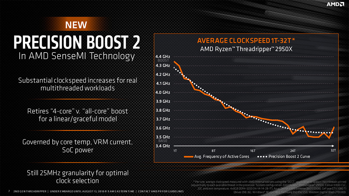 Pour tirer le meilleur parti de ses puces, AMD a utilise depuis Raven Ridge, la seconde itération de Precision Boost (la dénomination du turbo maison), qui permet de maintenir de manière opportuniste, une fréquence plus élevée que celle de référence, même au-delà de 2 cœurs sollicités si les conditions le permettent (température, intensité instantanée, etc.). De quoi proposer de fréquences élevées y compris sur des puces conséquentes, si toutefois l'enveloppe thermique allouée n'est pas trop limitante, comme c'était bien souvent le cas sur les premiers Threadripper.