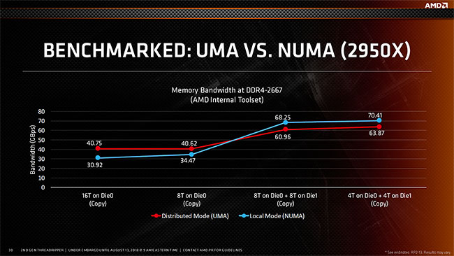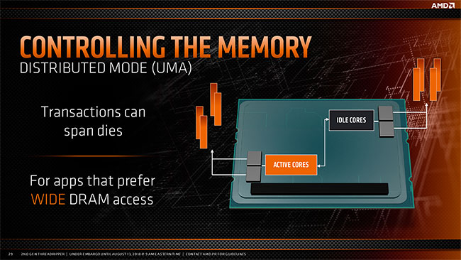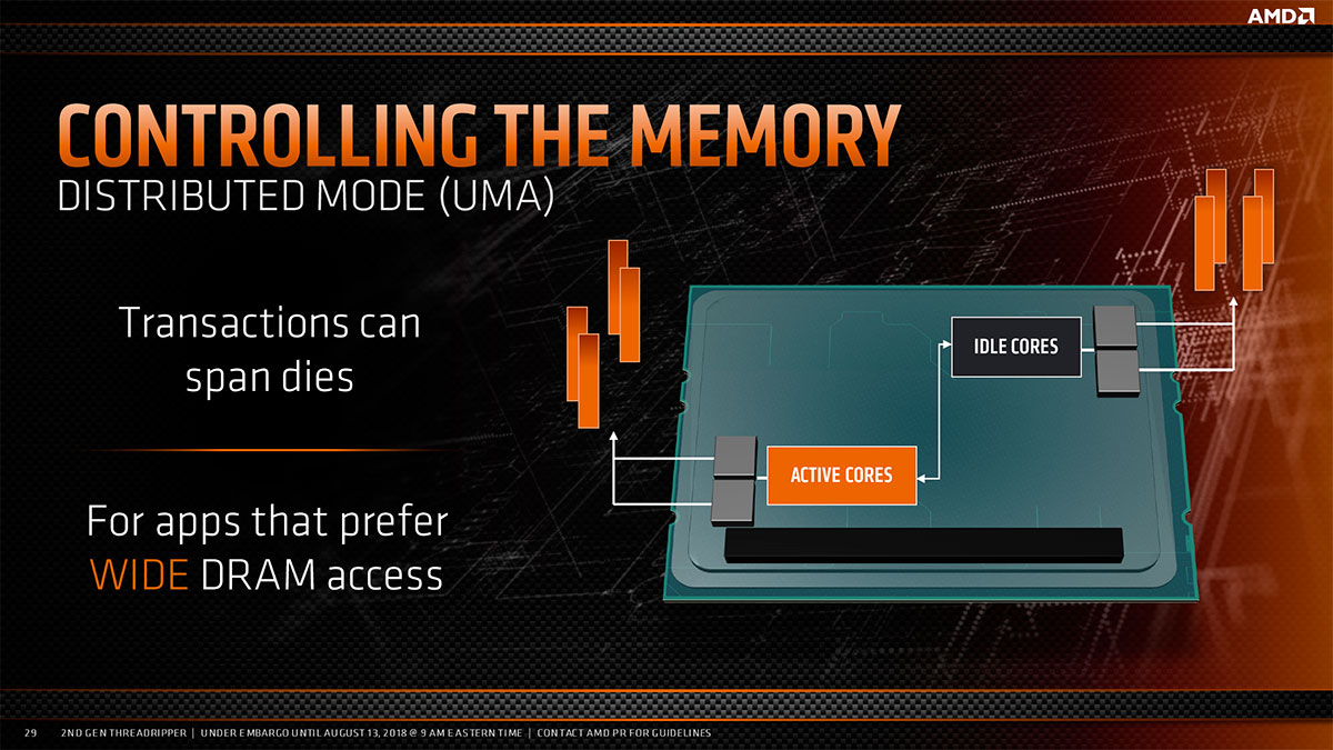 Dans un TR 2950X, chaque die actif dispose de son propre contrôleur mémoire (2 canaux), en conséquence la gestion mémoire peut cette fois adopter 2 modes différents. D'une part l'UMA (Uniform Memory Access) qu'AMD nomme Distributed et qui permet à chaque cœur d'accéder de manière uniforme à l'intégralité de l'espace mémoire, que ce dernier soit stocké sur un canal liés au die exécutant le processus comme sur l'autre, AMD évoque un ratio jusqu'à 1,6 pour la latence entre ces 2 cas. La bande passante est par contre généralement supérieure à celle obtenue en NUMA, du fait d'un accès plus large à la mémoire. C'est ce mode qui est actif par défaut.