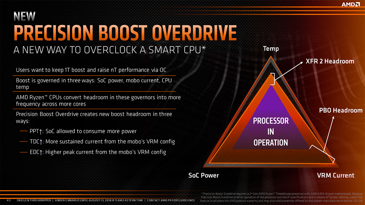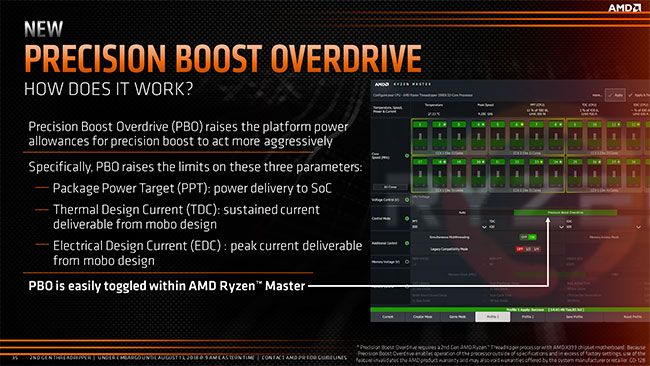 Poursuivons ce tour d'horizon de nos Threadripper 2 avec Precision Boost Overdrive. Kesako ? En fait, il s'agit de la capacité à conserver des fréquences élevées, normalement appliquées avec peu de cœurs actifs, et ce même si de nombreux cœurs sont sollicités, s'affranchissant ainsi des critères traditionnels de Precision Boost.