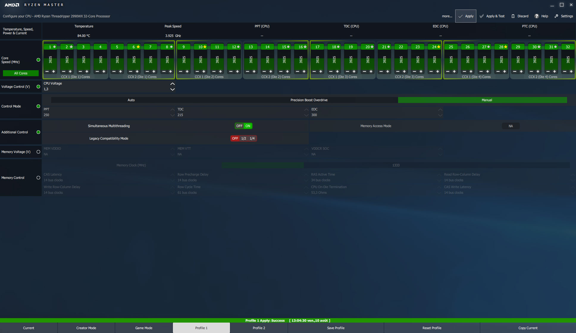 Ci-dessous la capture d'écran de Ryzen Master lors de cet overclocking, à noter les étoiles indiquant les "meilleurs" cœurs de chaque die et CCX.